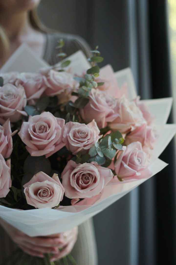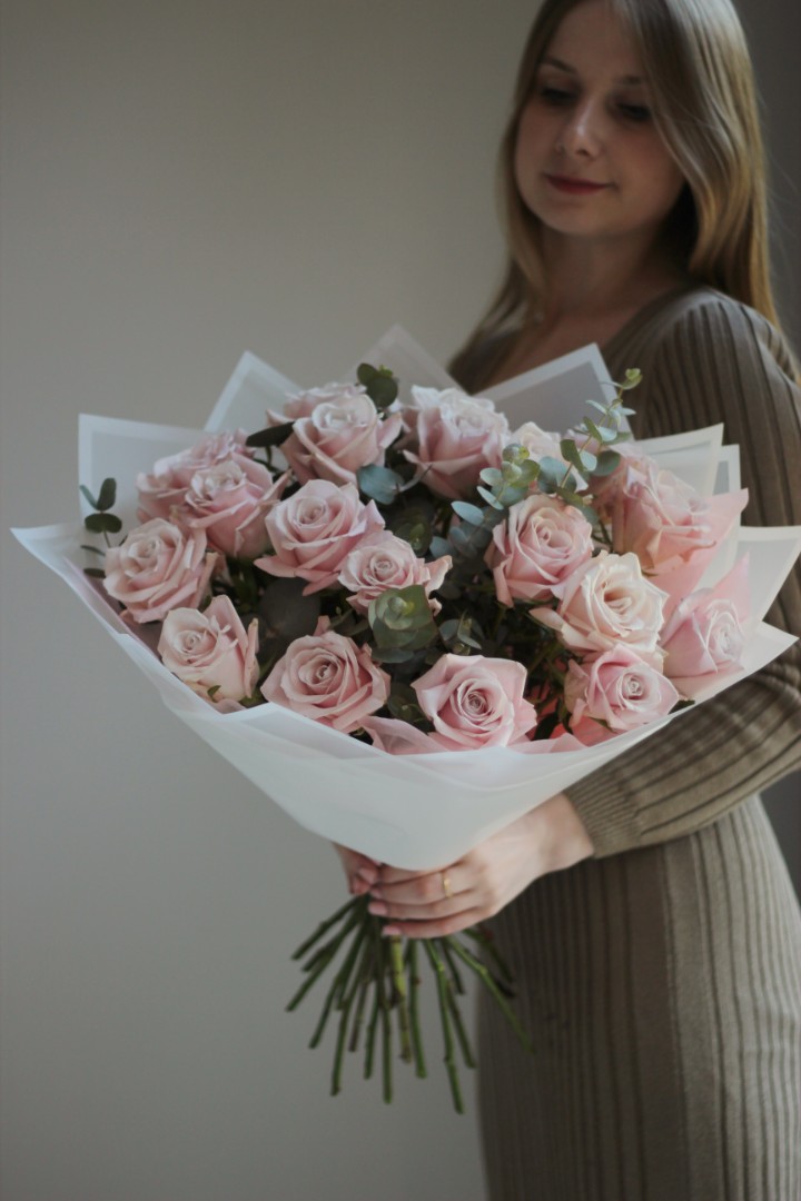 Букет из 19 нежных роз с эвкалиптом в упаковке