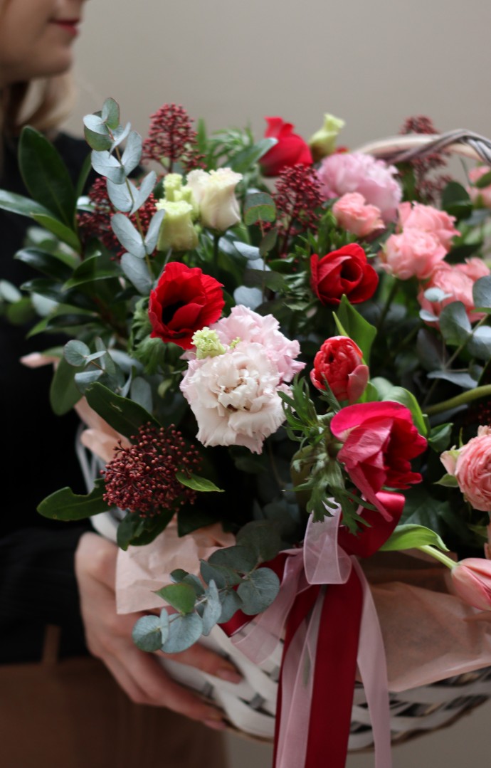 - - Анемоны,тюльпаны,скиммия,эустома,эвкалипт,кустовые пионовидные розы