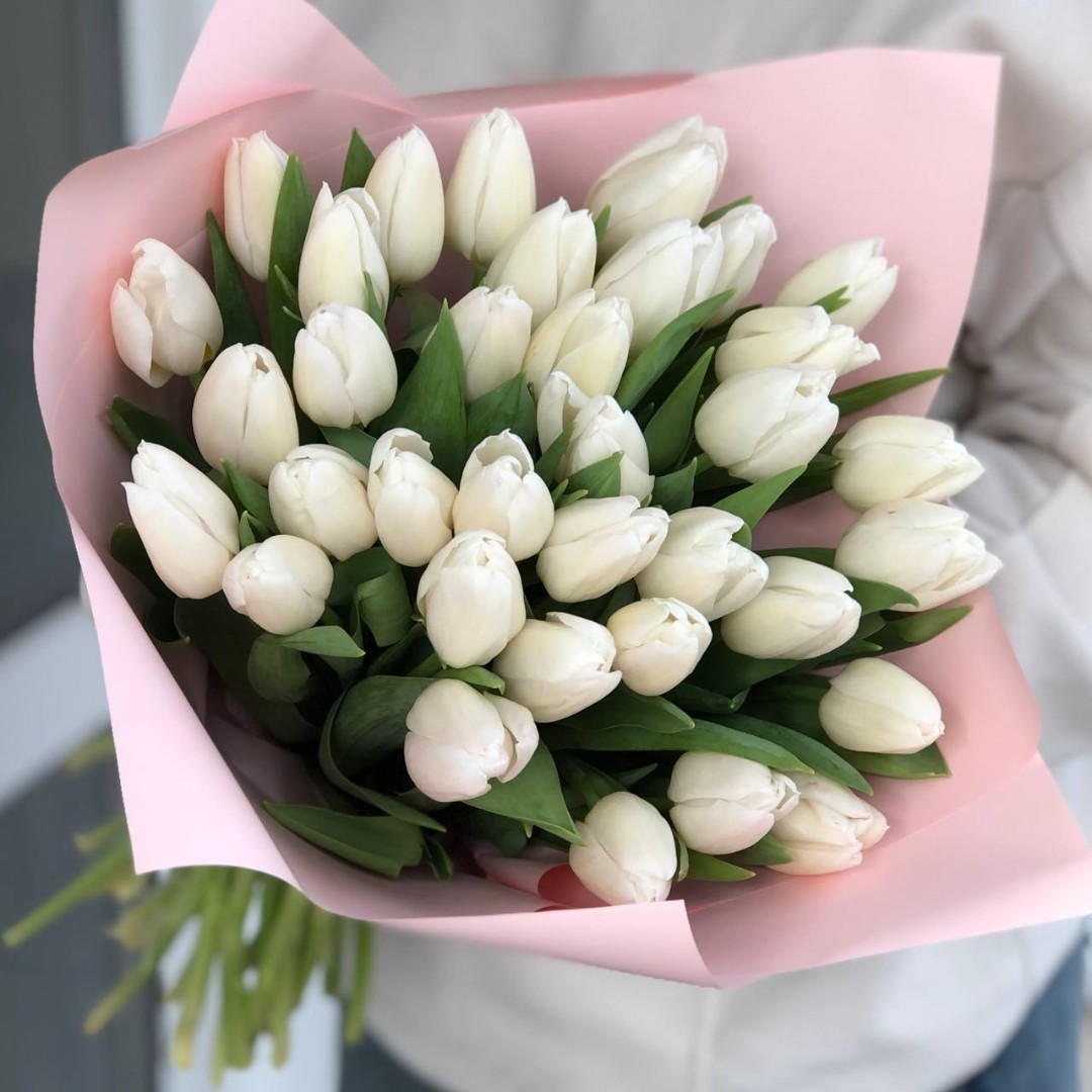 Букет из 35 белых тюльпанов в упаковке