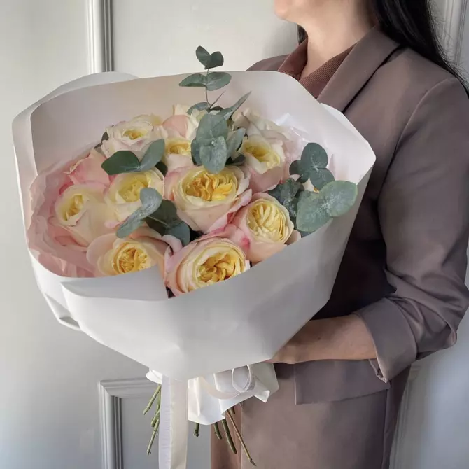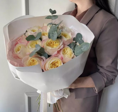 - - 11 пионовидных роз, эвкалипт