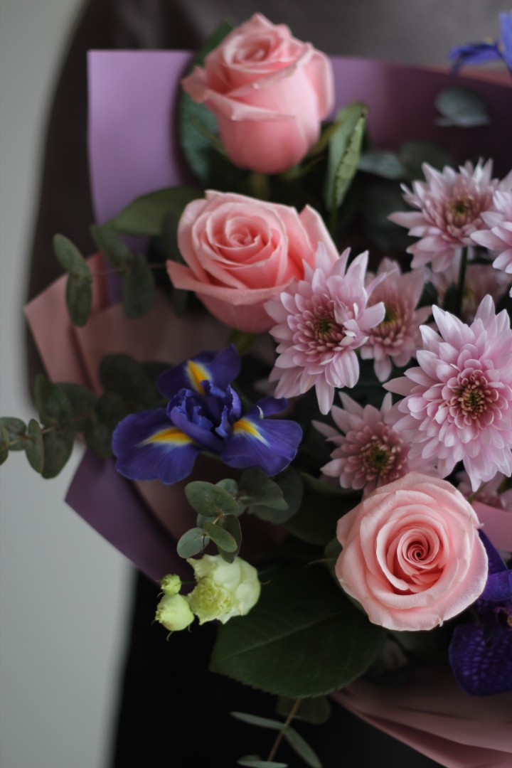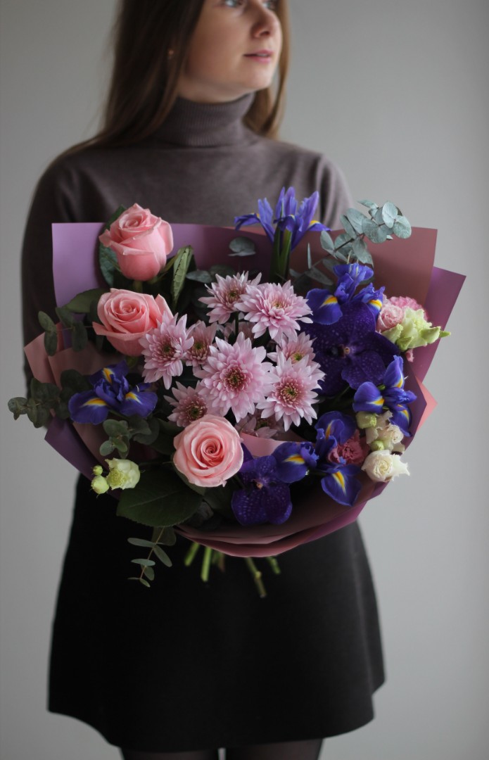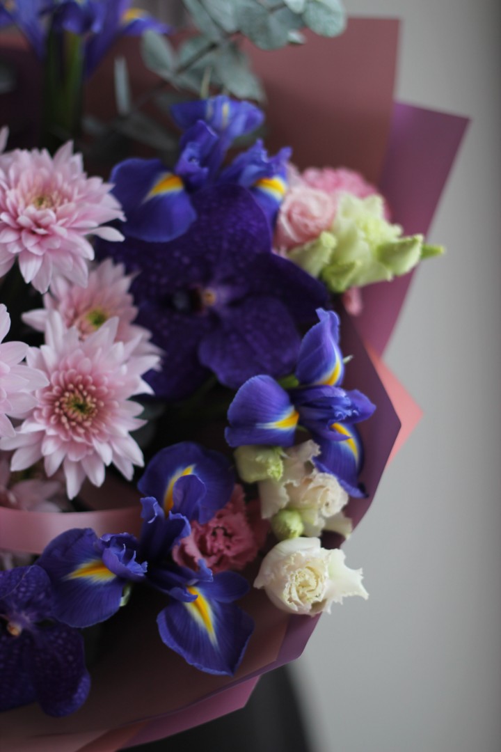 - - Ирисы,ванда,хризантема кустовая,розы,эустома,эвкалипт