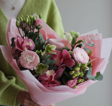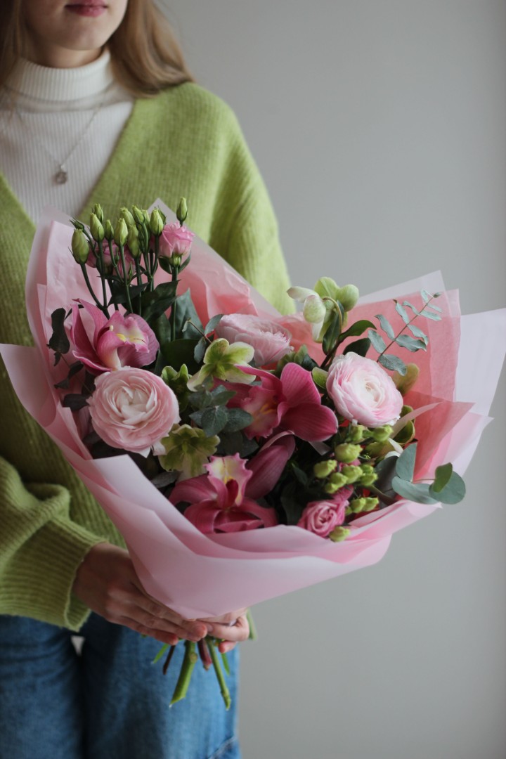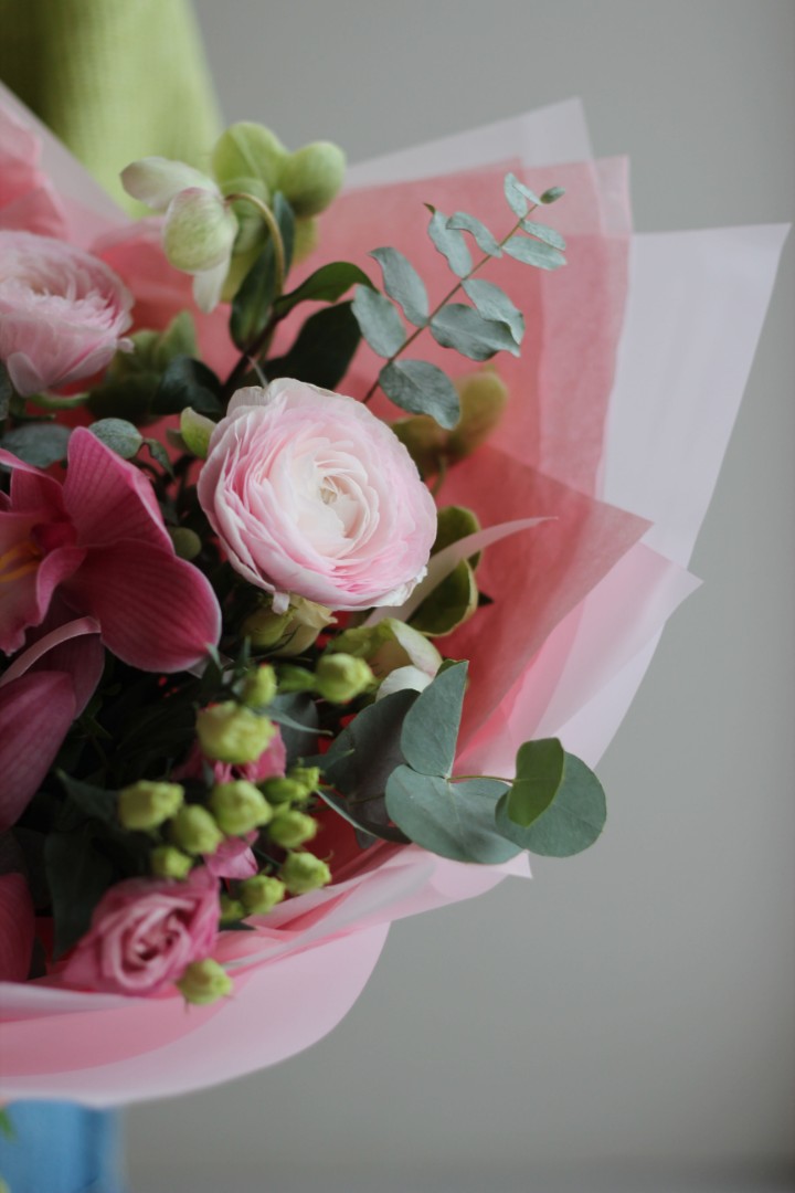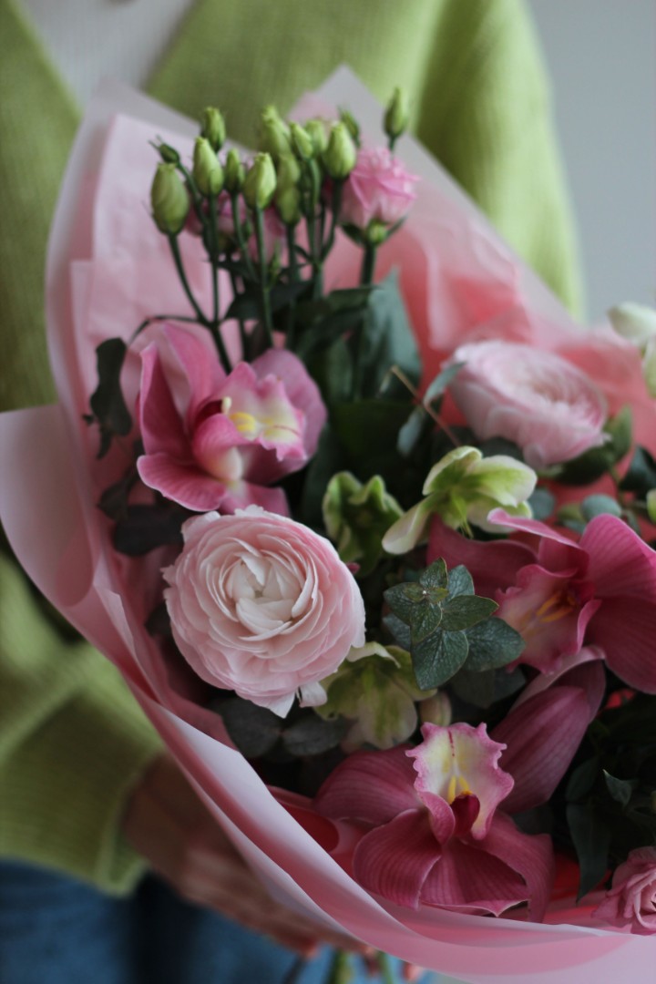 - - 3 ранункулюса, 2 хелеборуса, 3 орхидеи,2 эустомы,эвкалипт