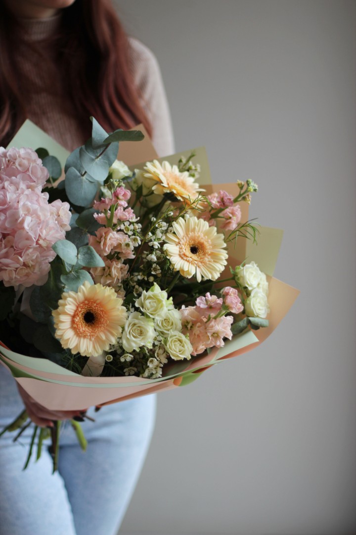 - - Гортензия, 3 гермини,хамелациум, 3 маттиолы, кустовые розы,эвкалипт