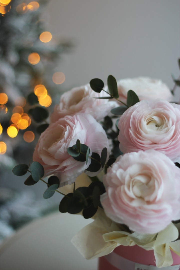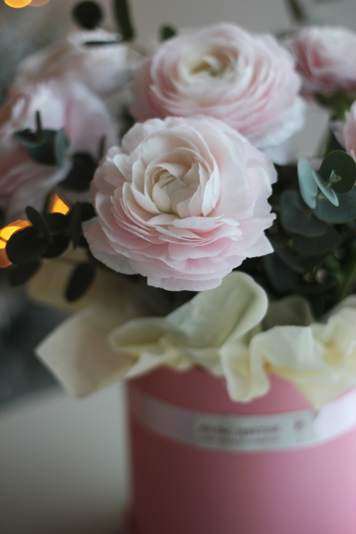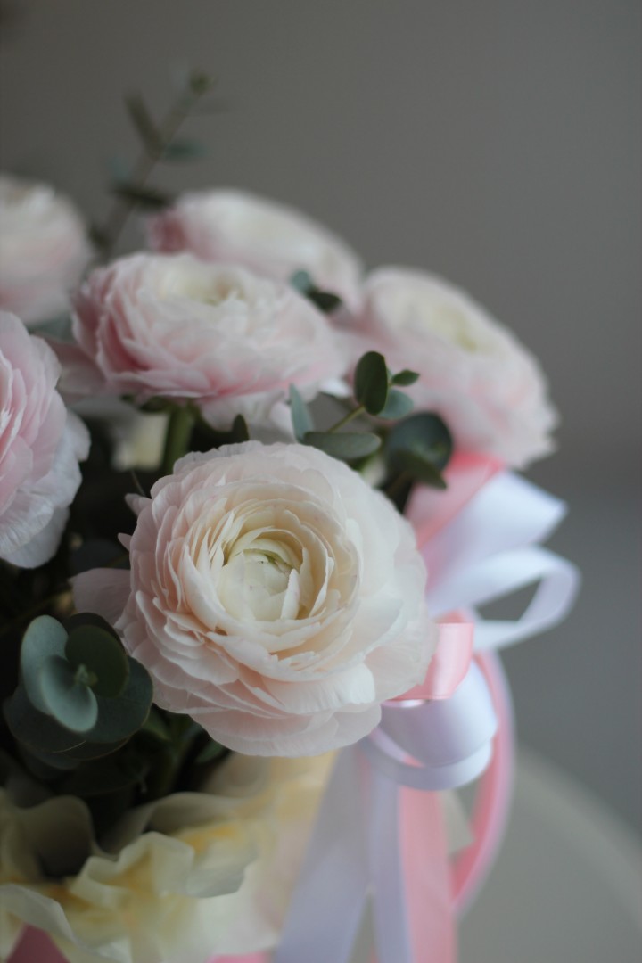 Шляпная коробка из 9 ранункулюсов с эвкалиптом