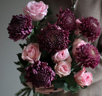 - - 6 хризантем, 9 пионовидных роз