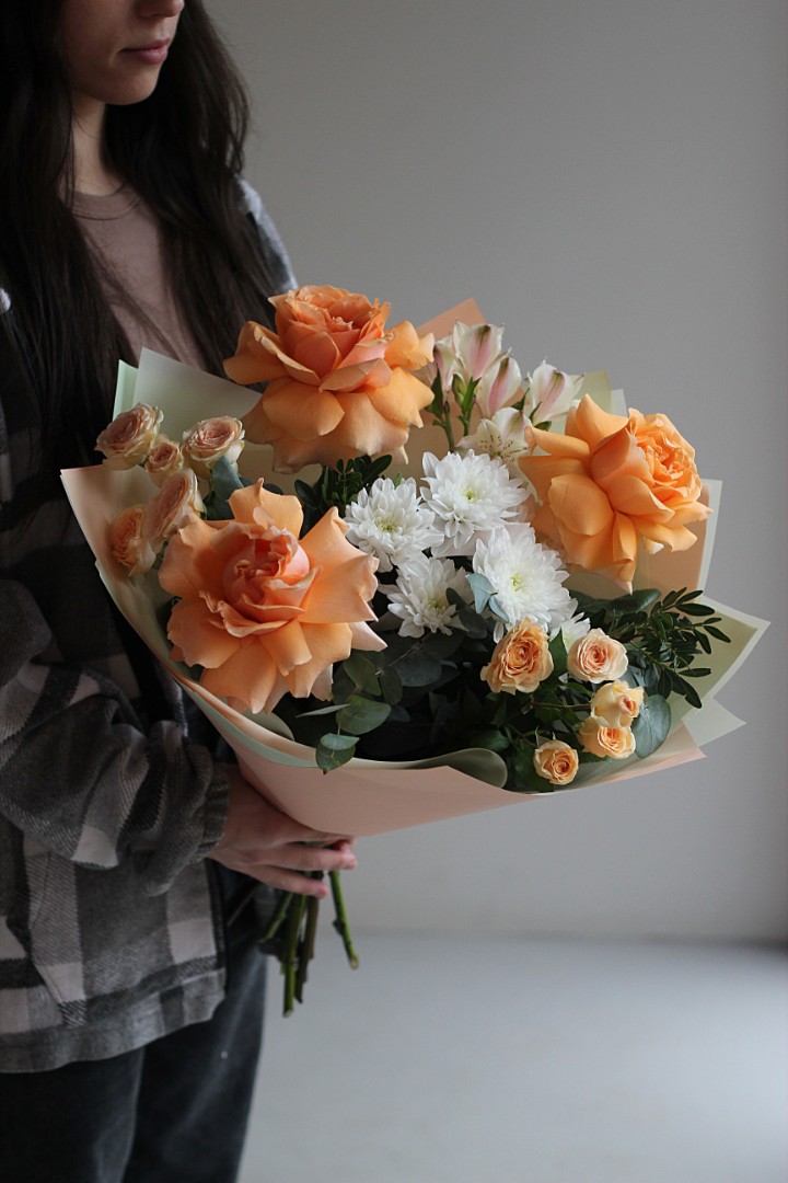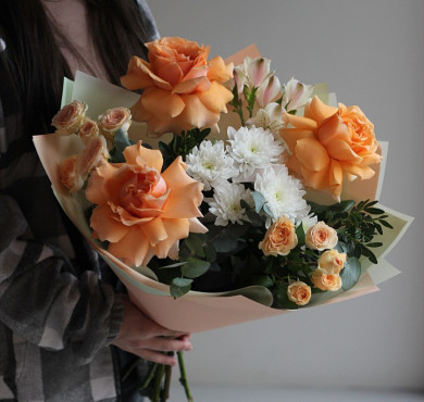 - - Французские розы,альстромерии, кустовые розы, хризантема кустовая,эвкалипт