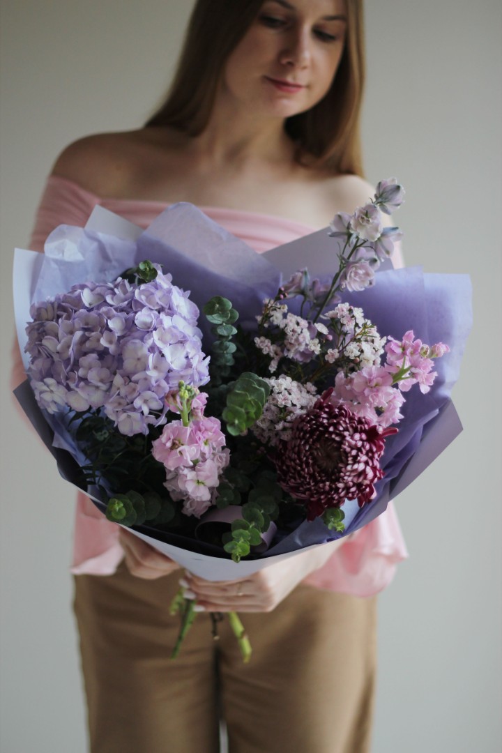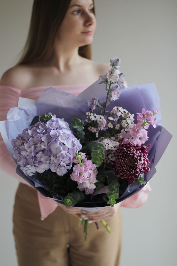 - - Гортензия,эвкалипт,хамелациум,маттиола,одноголовая хризантема