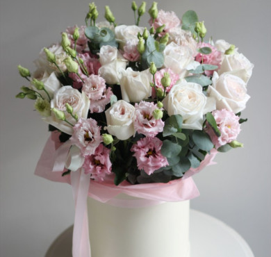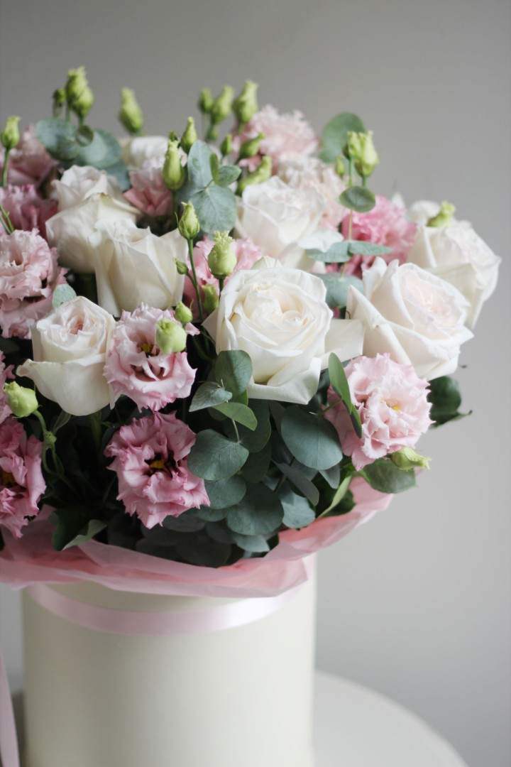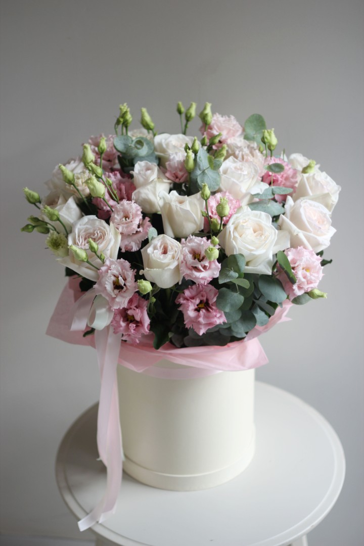 Шляпная коробка из 9 ранункулюсов с эвкалиптом