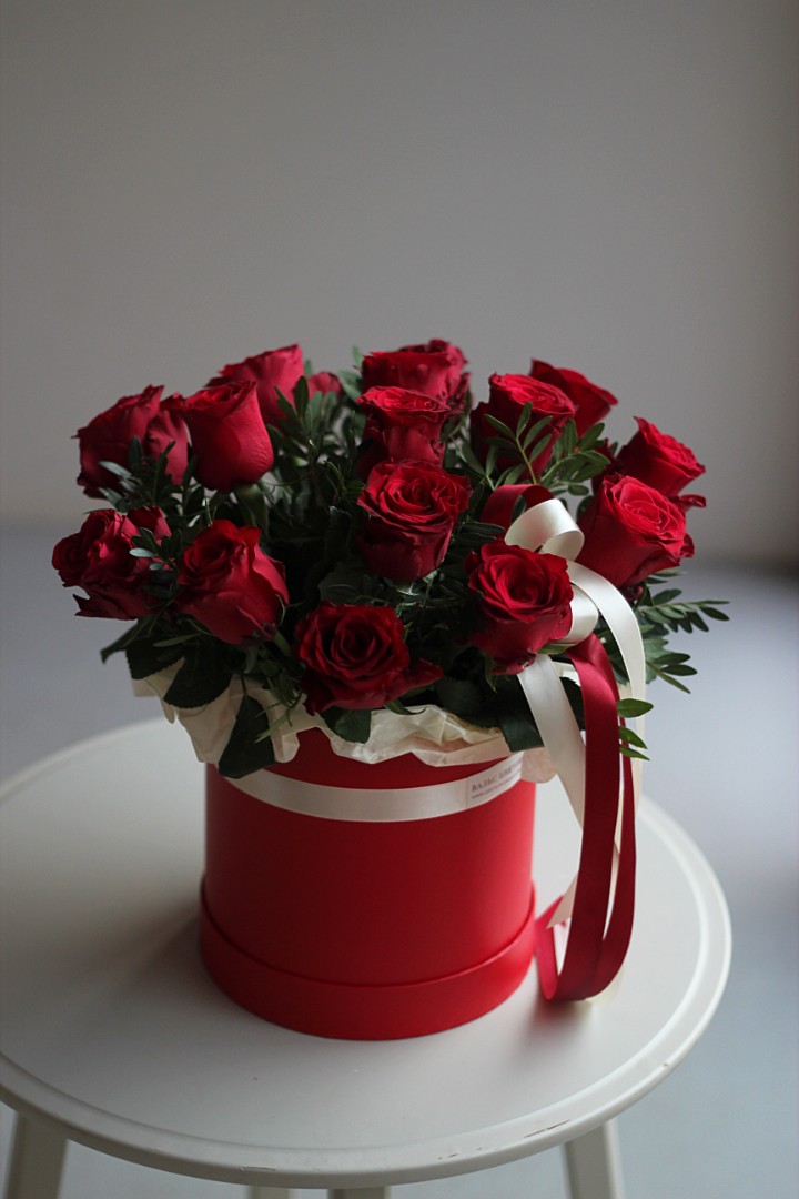 Шляпная коробка с ранункулюсами и орхидеями "Ангел"