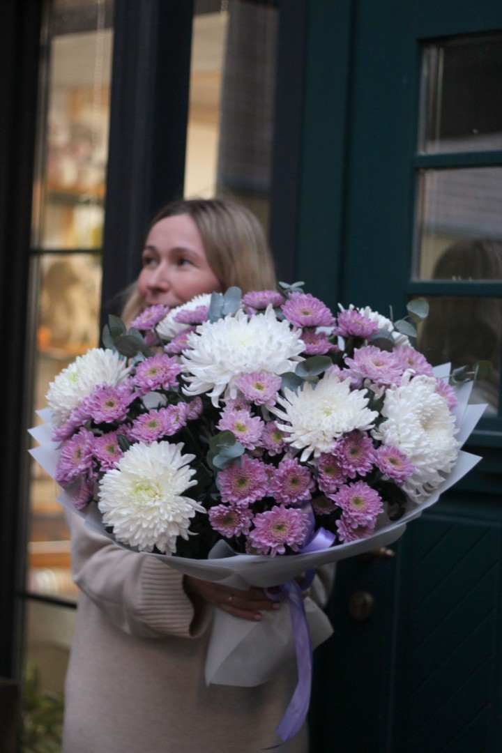 Букет хризантем с эвкалиптом